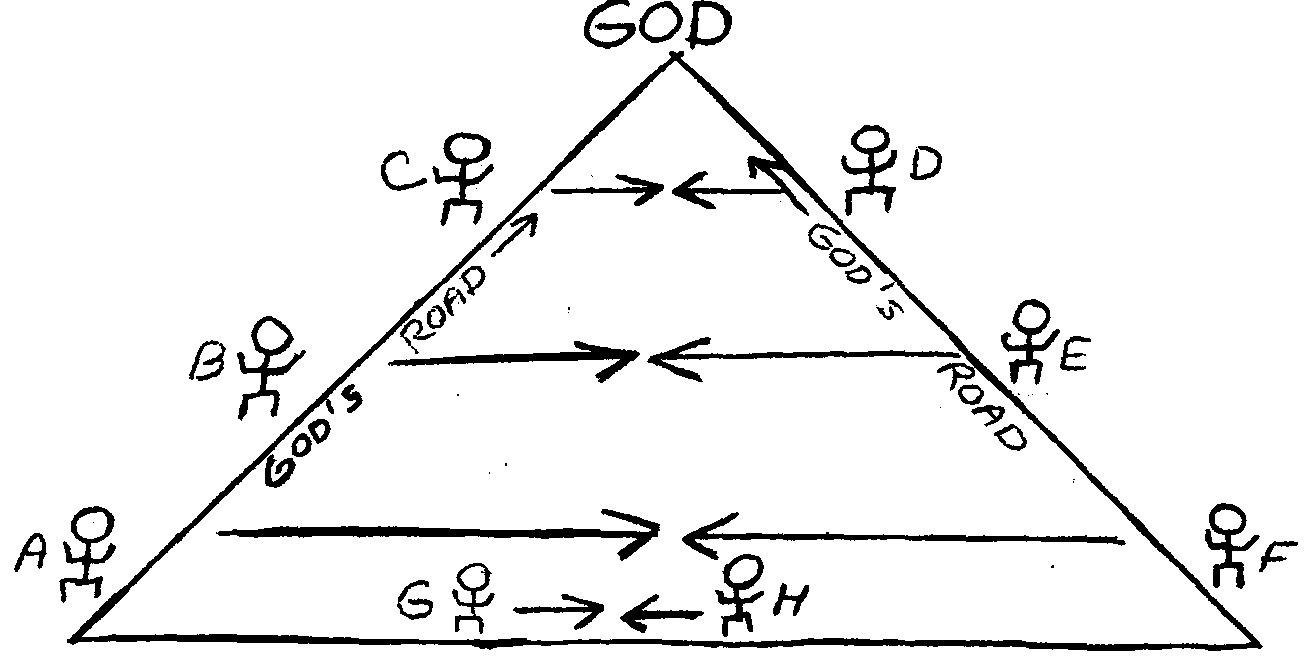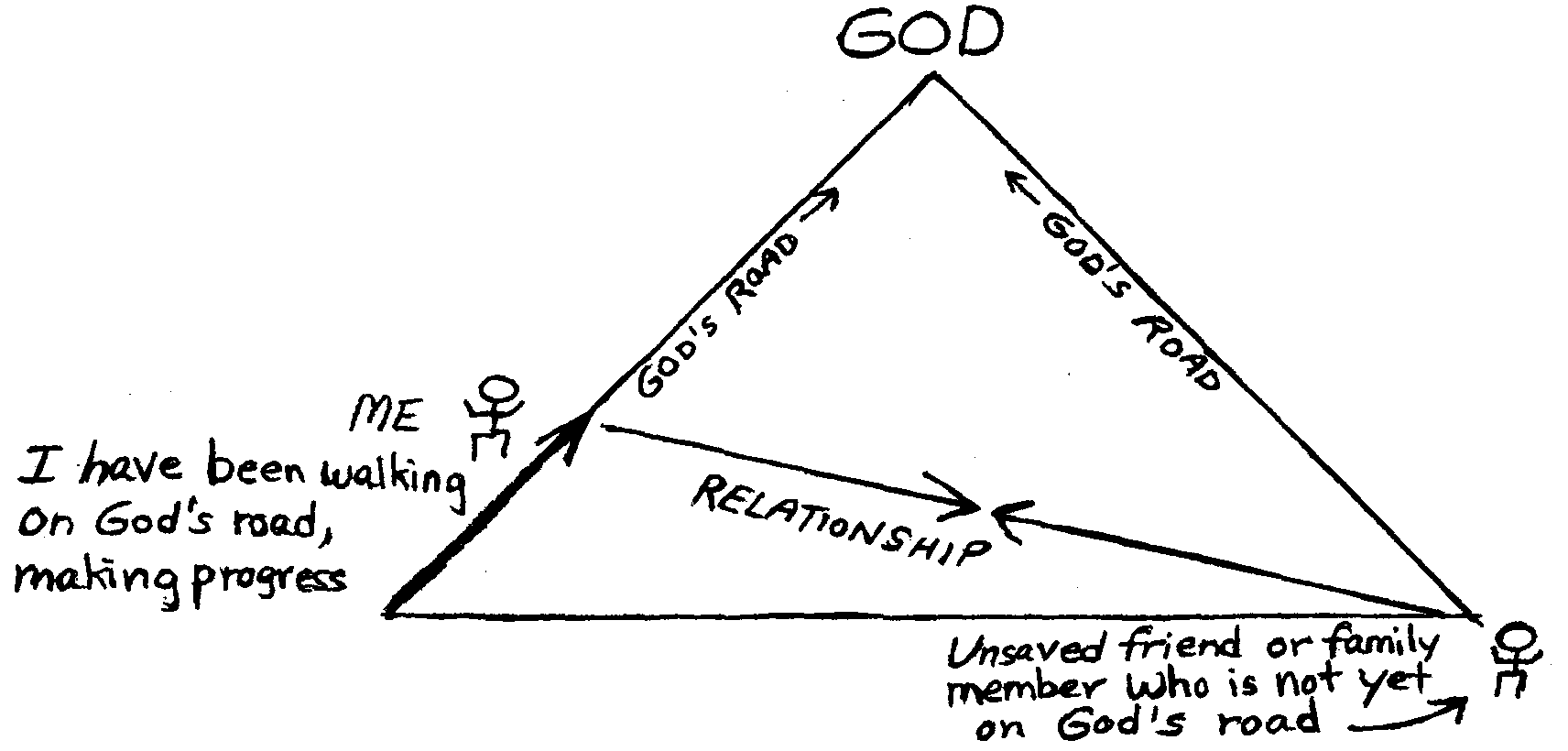 According to this diagram (and according to my understanding of geometry), if I continue to make progress on Gods road, will my relationship with the unsaved person grow farther apart?______ (This is what we meant on the previous page when we said the relationship could never become less solid or less strong). Will my relationship with this person be for the better or for the worse? What would happen to our relationship if this person were to begin to go down the right road as well?